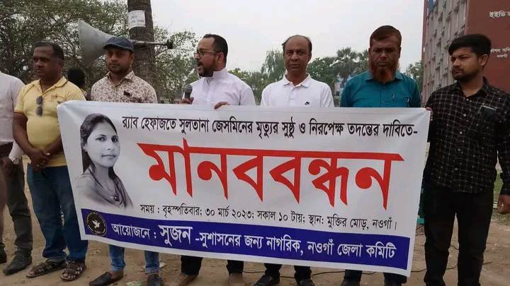 নওগাঁয় র্যাব হেফাজতে নারীর মৃত্যু, সুষ্ঠু ও নিরপেক্ষ তদন্তের দাবীতে মানববন্ধন