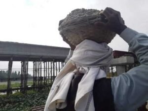 মাটির ডালি মাথায় আলহাজ আব্দুল বাতেন।